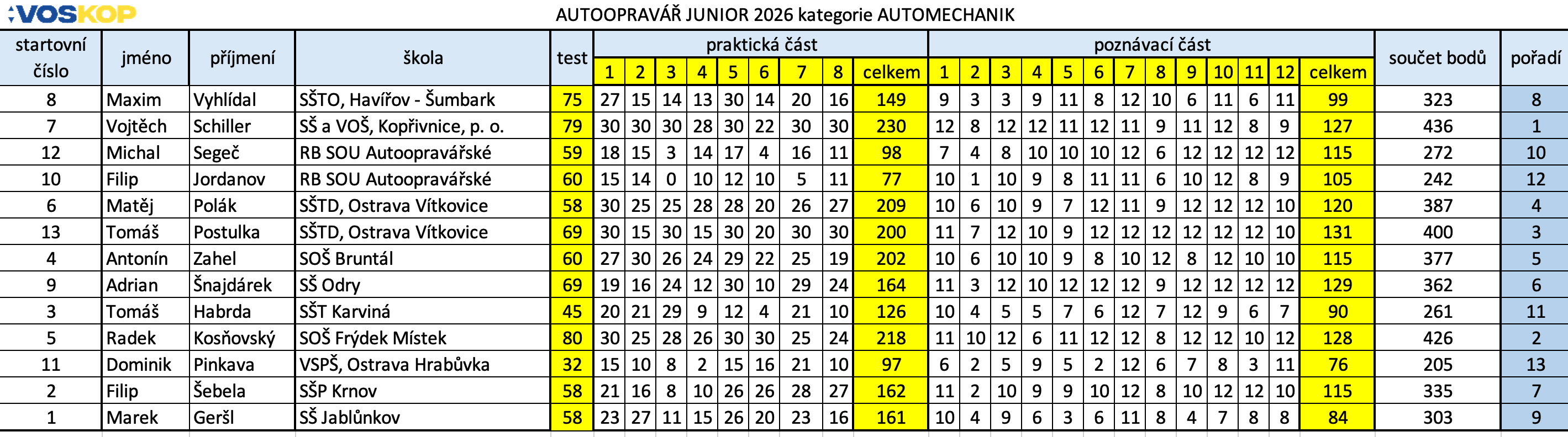 3.2. proběhla soutěž Autoopravář junior 2026 na Střední škole a Vyšší odborné škole v Kopřivnici. Soutěžících bylo celkem 13 a náš student Antonín Zahel se umístil na 5. místě. Gratulujeme k pěknému umístění a děkujeme za reprezentaci naší školy.