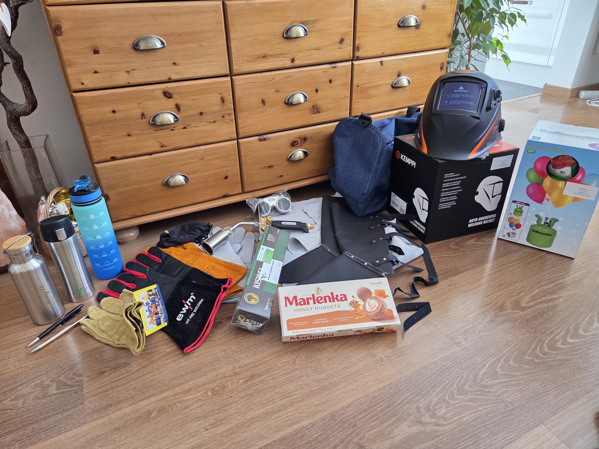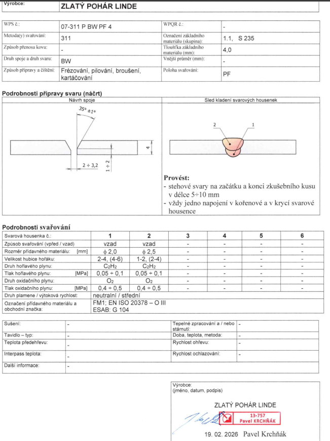- Koutový svar (P FW PD): Svařování plechu o tloušťce 3 mm v poloze vodorovné nad hlavou.