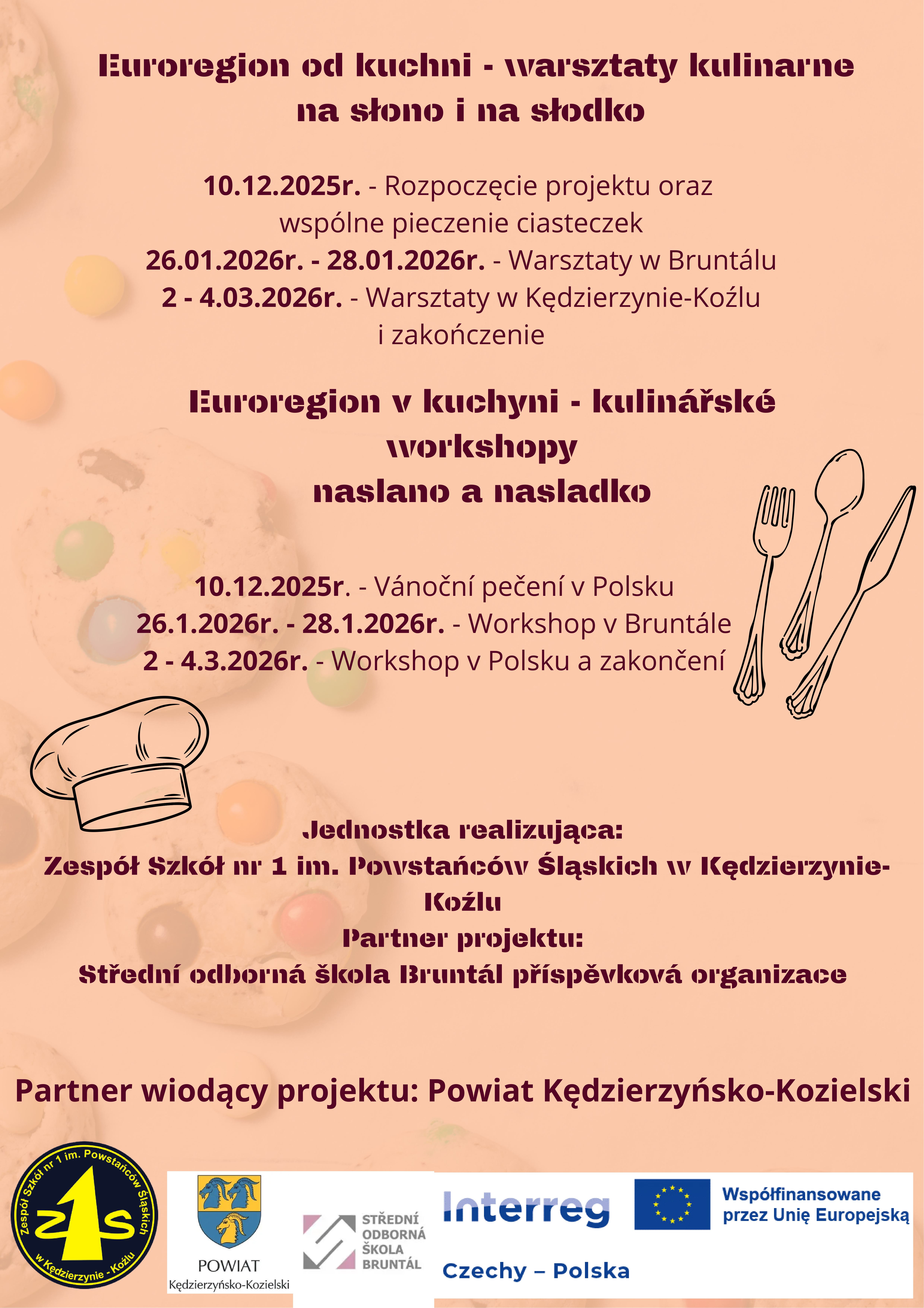 „Euroregion od kuchyně – workshopy na sladko i slano” je projekt, který bude naše škola v následujících měsících realizovat společně s českou školou s podobným vzdělávacím zaměřením z Bruntálu (Střední odborná škola Bruntál).