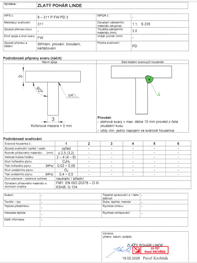 - Koutový svar (P FW PD): Svařování plechu o tloušťce 3 mm v poloze vodorovné nad hlavou.